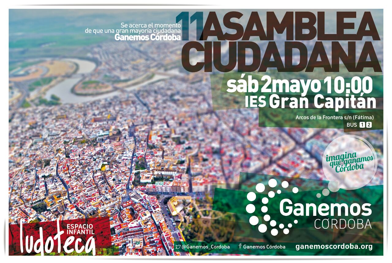 En la XI Asamblea General "Ganemos Córdoba" que tendrá lugar el próximo día 2 de mayo a las 10h en el salón de actos del I.E.S. Gran Capitán, sito en la C/ Arcos de la Frontera s/n, y cuya convocatoria fue anunciada hace unos días, se presentará y aprobará el Plan de Gobierno con el que nuestra Agrupación de Electores aspira a conquistar la Alcaldía de Córdoba.