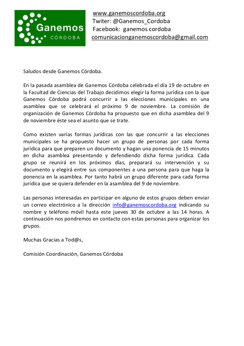 [embed]https://www.youtube.com/watch?v=zc7SPNJEGZo&list=UUz0aeMU6DKwtDiy-s9MMuXA[/embed]Ganemos Córdoba irá a las municipales como Agrupación de Electores